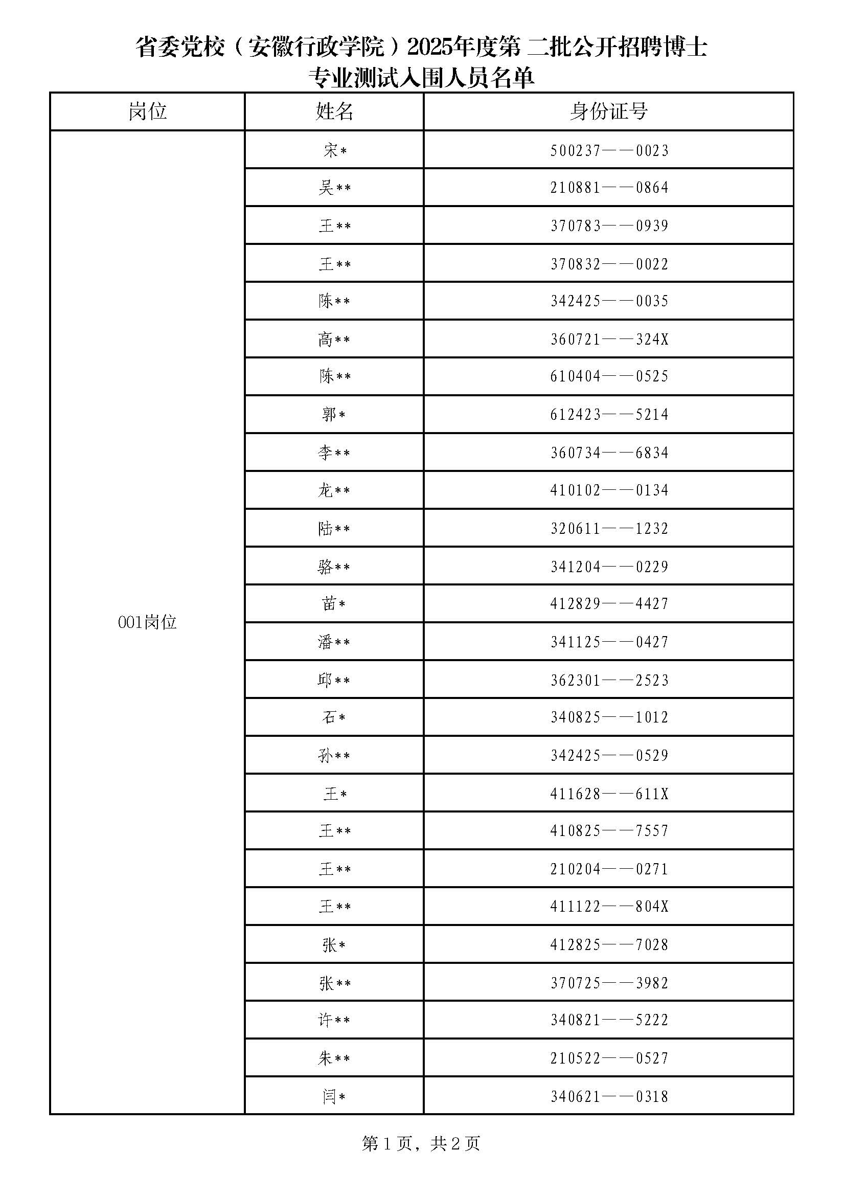 根據(jù)《中共安徽省委黨校(安徽行政學(xué)院)2025年度第二批公開招聘博士公告》,現(xiàn)將省委黨校(安徽行政學(xué)院)2025年度第二批公開招聘博士專業(yè)測試入圍人員名單公布如下。